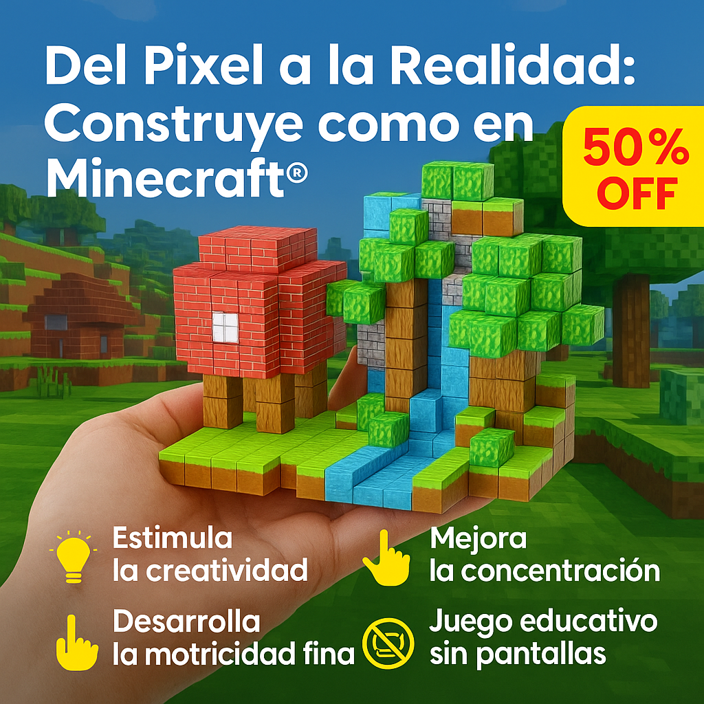 Permite construir estructuras libres, personajes o escenarios como en Minecraft®, desarrollando la imaginación.